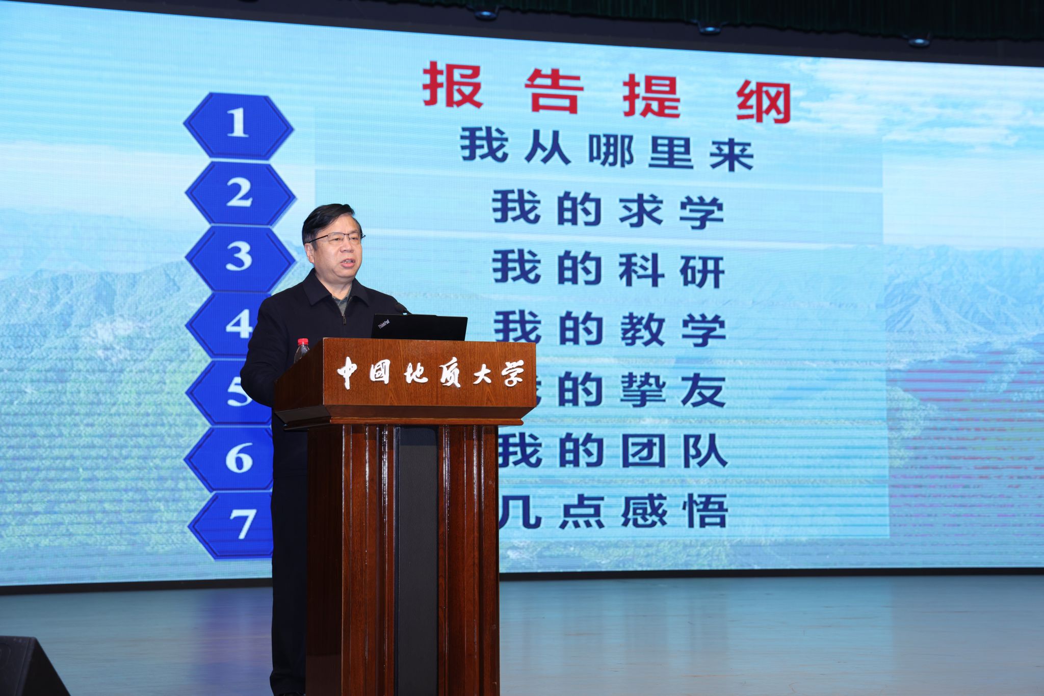 唐辉明院士以《我的学术之路》为题,分享了自身四十余载深耕地质领域的科研探索历程和育人心得。他从家乡江苏东台的地理人文切入,讲述了自己从平原走向山川、毕生深耕地质领域的人生历程,以“演化”为核心,贯穿求学、治学、科研、育人的全部学术生涯。针对青年师生在科研探索中的困惑,唐辉明院士结合自身实践,讲述了团队扎根三峡库区、西南基岩山区数十年,建成国际首个滑坡地下实验室、构建滑坡演化控制理论、打造全球首个滑坡实时数字化平台的历程,深刻诠释了“把科研论文写在祖国大地上”的初心使命。讲座尾声,唐辉明院士寄语青年学子:要立志高远、报效祖国;锚定学科前沿、勇于创新突破;注重团队协作、传承地大精神,将个人成长融入国家发展大局。